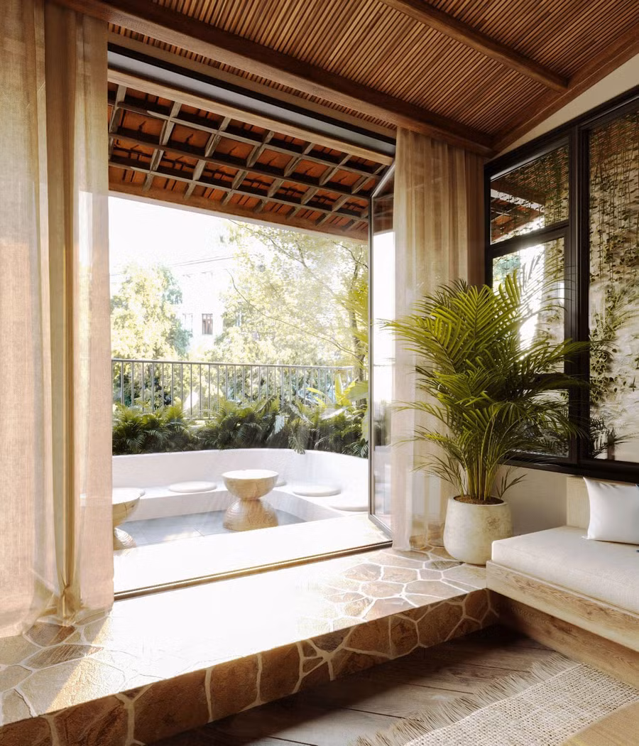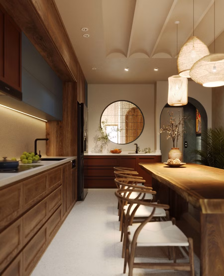 Ngôi nhà phố hẹp ngang, nên phương án đưa lối lưu thông cầu thang bộ và thang máy về cuối công trình, đưa phòng khách sinh hoạt và khu vực bếp, ăn lên tầng trên cùng, tạo không gian thoáng đãng khi kết hợp mái ngói, vườn cây để tăng sự thuần tuý, mộc mạc cho không gian sinh hoạt.