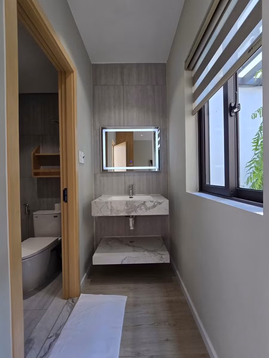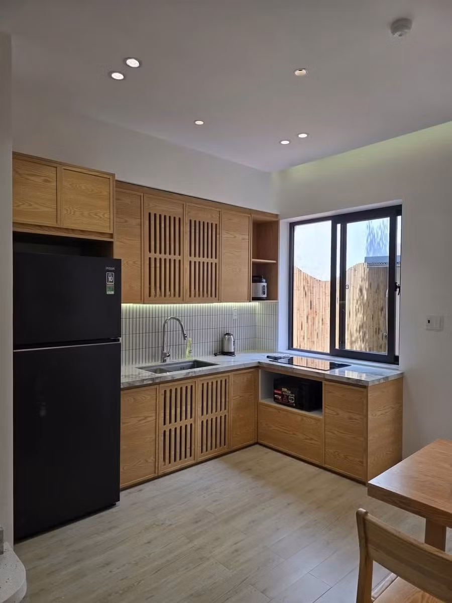 Điểm đắt giá nhất có lẽ là khoảng sân vườn phía sau, nơi có bàn ăn ngoài trời, sen tắm ngoài trời và cả hồ sục nóng lạnh. Một góc nhỏ thôi nhưng đủ để biến những buổi tối bình thường thành cảm giác như đang ở resort.