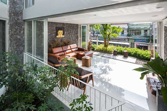 Phần mái hiên rộng cùng khoảng đệm cây xanh giúp gia chủ có thể thường xuyên rộng mở cửa đón nắng gió.