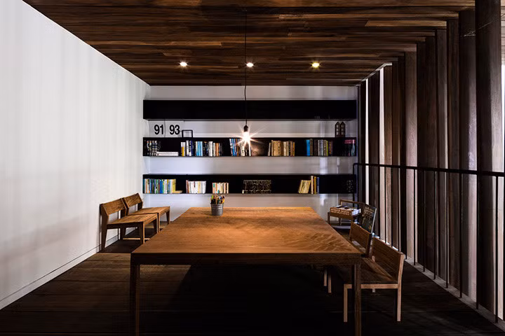 Một phòng làm việc vừa có thể kiêm luôn cả bàn họp hành cùng đối tác. Chủ nhà đã đặt một giá sách để đặt các tài liệu cần thiết.