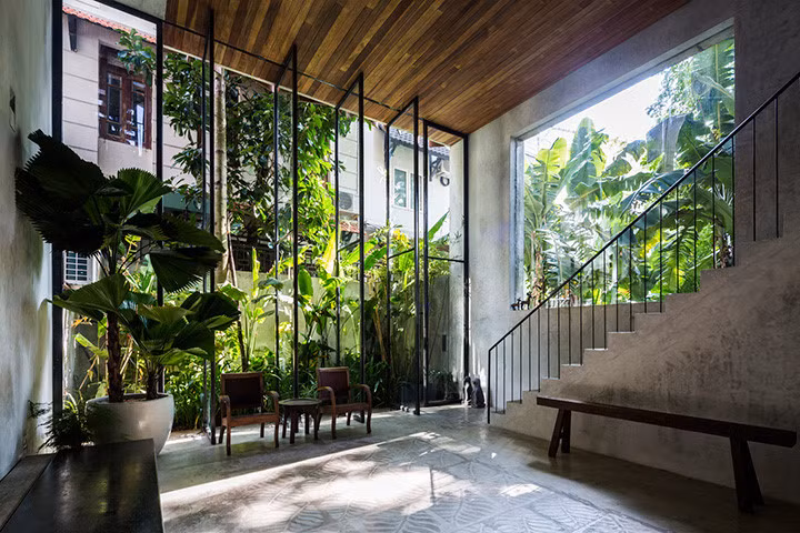 Có nhiều mặt thoáng và tường kính nhưng hệ thống cây xanh được bài trí hợp lý đã giúp cho ngôi nhà ở Quận 7 này luôn xanh mát và ngập tràn ánh sáng.