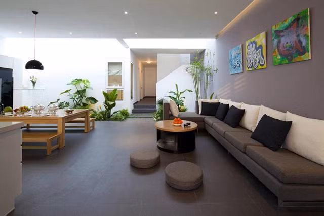Giếng trời ngay bên trên khu vườn nhỏ mang đến ánh sáng và gió tự nhiên giúp các thành viên sống trong nhà luôn có cảm giác thư thái, thoải mái.