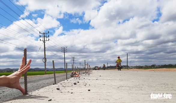 Những đoạn đường bêtông do Công ty TNHH Xây dựng cầu đường Hoàng Nam (Đắk Lắk) làm dang dở lòi những cây sắt dài 20-30cm dựng đứng lên mặt đường rất nguy hiểm cho người đi đường nếu chẳng may va quệt vào.