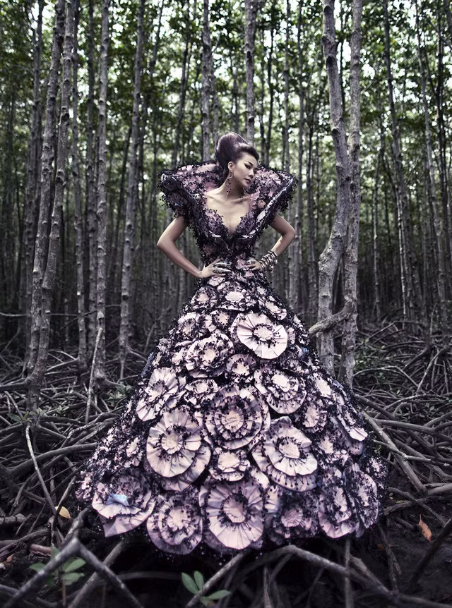| Với bộ sưu tập đầu tiên này, nhà thiết kế chọn chọn chất liệu chủ đạo là voan lưới, được xếp rất nhiều layer dập thủ công, tạo thành khối lớn. |