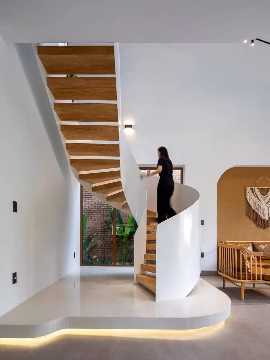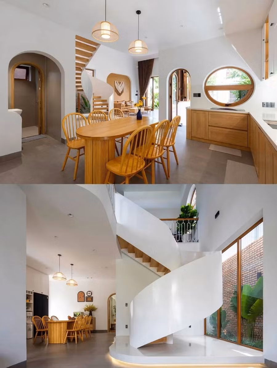 Bên trong, ngôn ngữ thiết kế tiếp nối sự uyển chuyển với tường cong, cửa vòm và vật liệu tự nhiên như gỗ sáng, terrazzo, tông kem trung tính. Điểm nhấn là cầu thang xoắn trắng vừa là kết nối giao thông, vừa như tác phẩm điêu khắc trung tâm.
