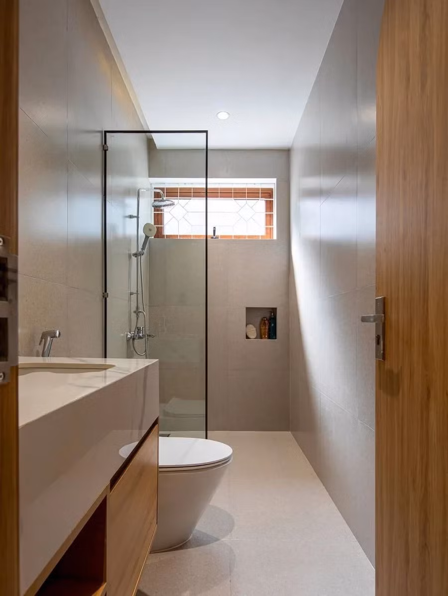 Mặt tiền gây ấn tượng với tông terracota ấm áp và những ô cửa tròn hiện đại. Bao quanh là mảng xanh: sân trước để xe, hành lang cây bên hông và khu vườn sau 4m nơi gia chủ có thể trồng rau sạch. Hệ mái ngói truyền thống vừa hòa nhập văn hóa địa phương, vừa đảm bảo cách nhiệt hiệu quả.