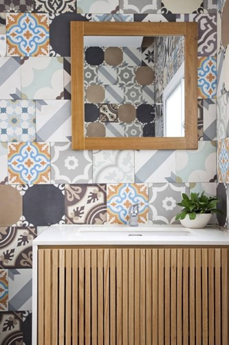 Phòng tắm với trang trí tường thật độc đáo, đây hầu hết là các mẫu gạch hoa có họa tiết được ưa chuộng vào những thập kỷ 80-90 của thế kỷ trước tại Việt Nam.