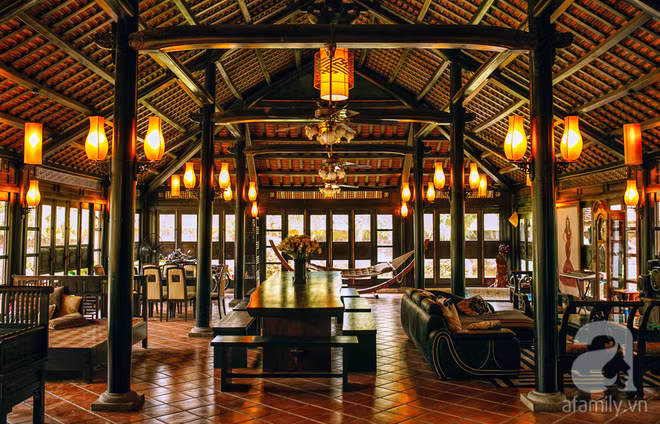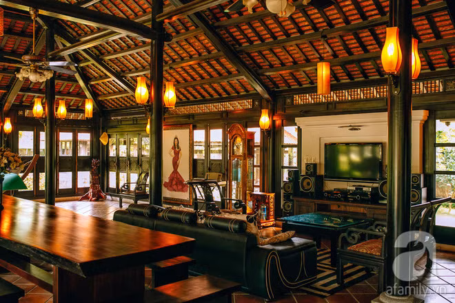 Không gian tiếp khách được bài trí vô cùng đặc biệt, pha trộn giữa nét dân gian và phong cách hiện đại.