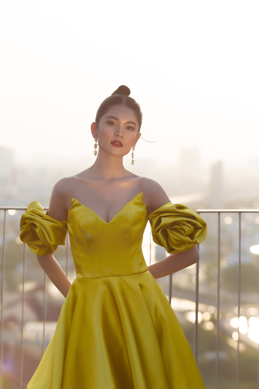 | Đầm chất liệu lụa cao cấp màu vàng, cúp ngực và nổi bật với hai bông hoa hồng nơi cánh tay áo độc đáo của NTK Thái Nguyễn. |