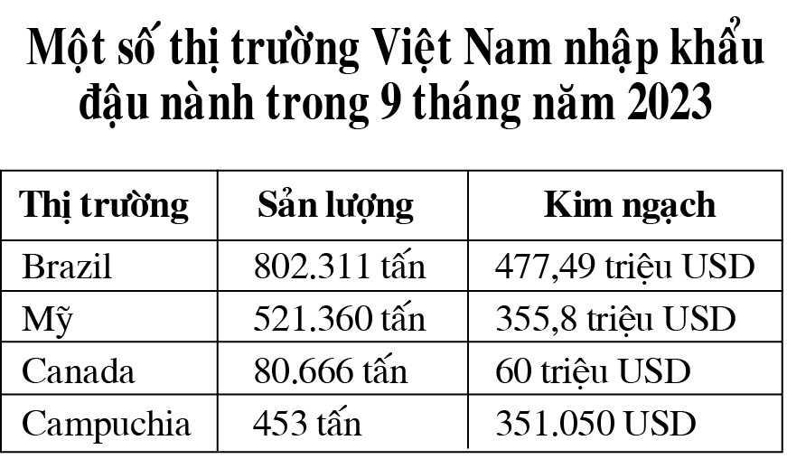 Ngoài ra, nhập khẩu đậu nành từ thị trường Canada đạt 80.666 tấn, trị giá 60 triệu USD (tăng 6% về lượng, tăng 7% về trị giá so với cùng kỳ năm 2022). Nhập khẩu từ thị trường Campuchia đạt 453 tấn, trị giá 351.050 USD (giảm 93% cả về lượng và trị giá so với cùng kỳ năm 2022).