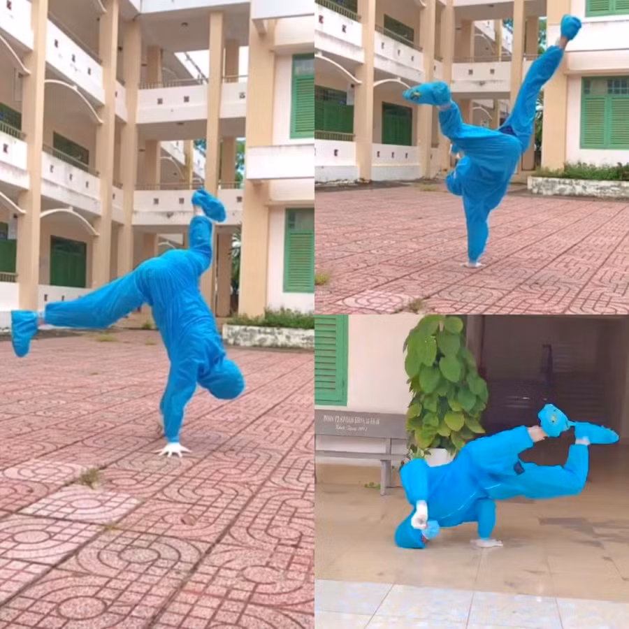 | Hùng nhảy hip hop trong trang phục đồ bảo hộ kêu gọi người dân tập luyện thể thao. Ảnh: NVCC |