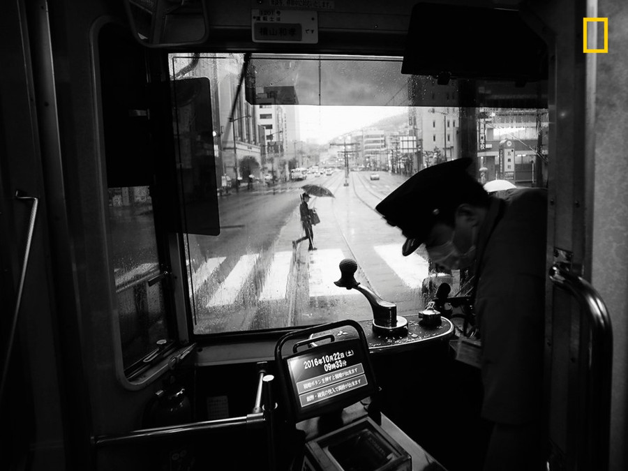 Giải nhất hạng mục Thành phố: “Một ngày mưa khác ở Nagasaki, Kyushu” - Hiro Kurashina. Ảnh chụp ghi lại góc nhìn phố chính từ một tàu điện trong ngày mưa ở Nagasaki. Khung cảnh yên bình ấy đối lập với những thành phố trung tâm đông đúc ở Nhật Bản như Tokyo và Osaka. Dù được trang bị hệ thống soát vé tự động, bức ảnh ghi lại sự cũ kỹ hoài cổ của chiếc tàu điện và người lái tàu lặng thầm.