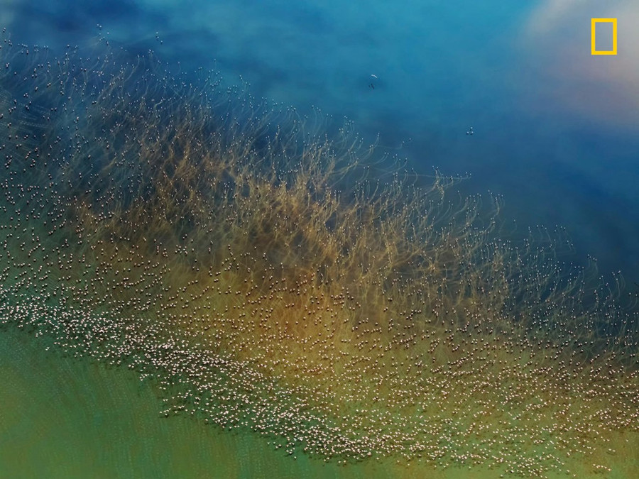 Giải nhì hạng mục Thiên nhiên: “Chim hồng hạc cất cánh bay” - Hao J. Nhìn từ trực thăng, hàng nghìn con chim hồng hạc như một tuyệt tác san hô biển trôi trên dòng nước hồ Natron (Tanzania). Trước khi bay, hồng hạc phải chạy một quãng ngắn tạo đà trên mặt nước. Trong khoảnh khắc ấy, những đôi chân dài màu hồng đỏ của chúng tạo thành sóng nước lăn tăn trên mặt hồ.