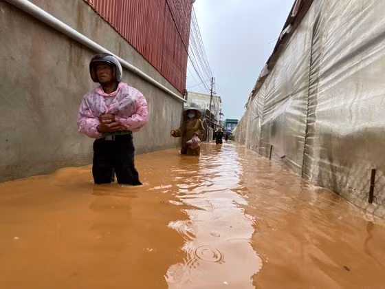 | Người dân di chuyển qua khu vực ngập sâu trong nước chiều 17-5. Ảnh: ĐOÀN KIÊN |