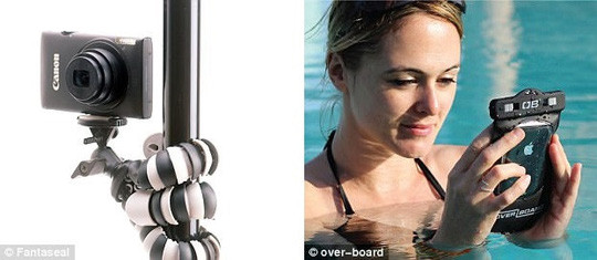 Chiếc chân máy ảnh kiểu vòi bạch tuộc (trái) có thể quấn quanh bất cứ thứ gì để lấy góc hoàn hảo. Ốp điện thoại chống thấm nước của Overboard (phải) giúp bạn chụp ảnh, quay phim và gửi tin nhắn dưới nước.