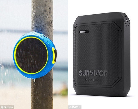 Loa chống thấm nước Braven 105 (trái) vẫn hoạt động tốt khi ngâm nước 30 phút, đặc biệt có thể phát nhạc trong 8 tiếng không cần kết nối dây. Thiết bị sạc Griffin Survivor Power Bank (phải) có thể tồn tại kể cả rơi từ độ cao gần 2 m và có khả năng sạc đầy 4 lần với tất cả thiết bị dùng dây nối USB.
