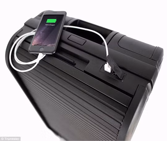 Chiếc vali Trunkster không có khóa kéo mà được thiết kế như cửa cuốn, giúp bạn dễ dàng lấy đồ đạc. Ngoài ra vali còn có cân tích hợp, thiết bị theo dõi toàn cầu và cổng sạc USB.