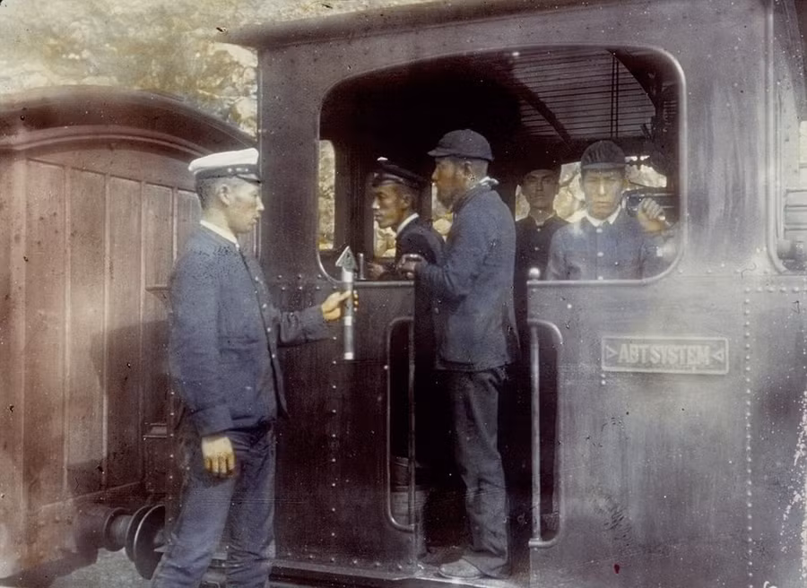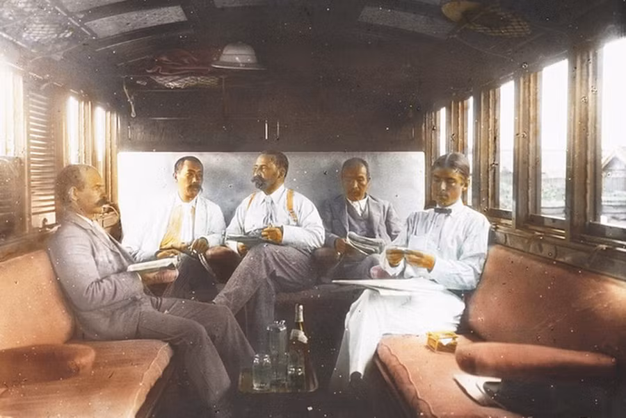Bức ảnh chụp năm 1895, khi các thành viên của Ủy ban Vận tải Quốc tế ngồi bên trong chiếc xe lửa riêng của họ và thưởng thức đồ uống trong một lần di chuyển.