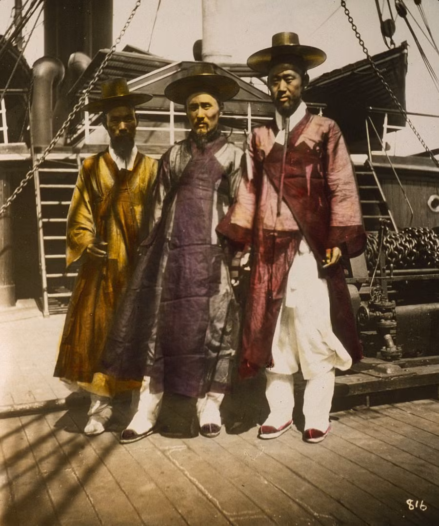 Những người đàn ông Hàn Quốc đứng trên boong một con tàu vào năm 1895.