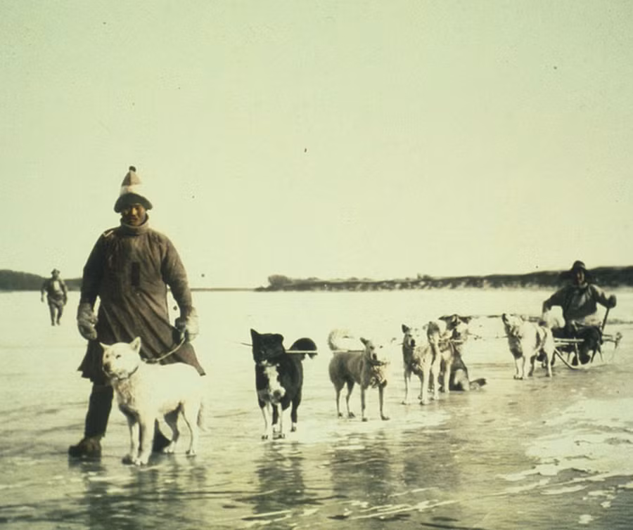 Những người đàn ông người Goldi bên cạnh chiếc xe chó kéo trên con sông Amur đóng băng ở đông nam nước Nga vào năm 1895.