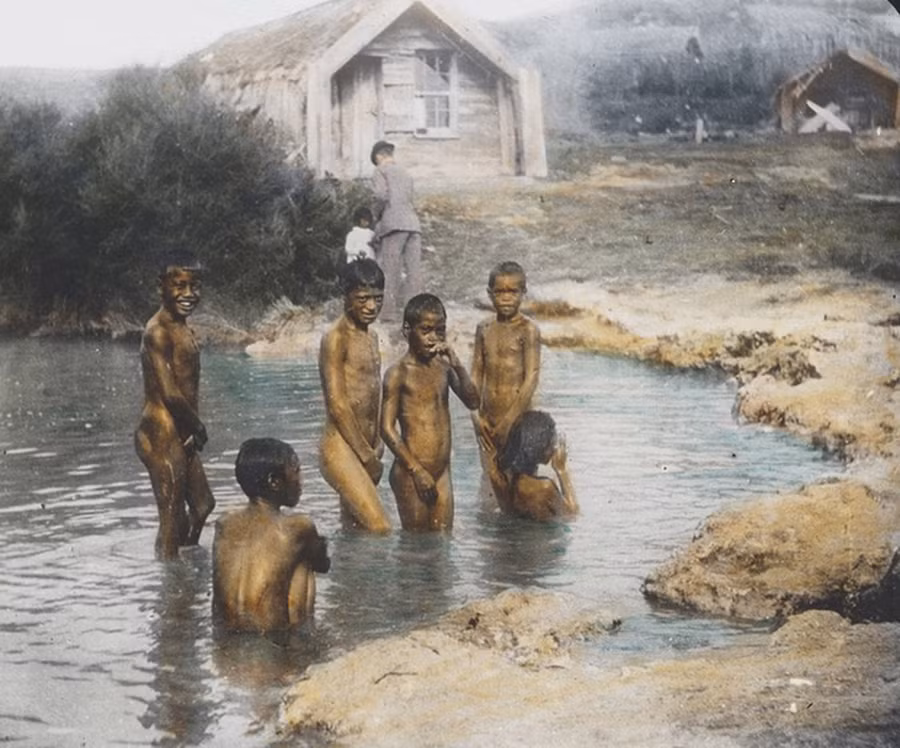 Những cậu bé người Maori ở New Zealand tắm trong một hồ nước nhỏ vào năm 1895.