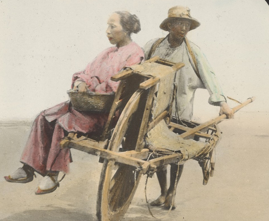 Bức ảnh được cho là chụp ở Trung Quốc. Một phụ nữ nhà quyền quý ngồi trên chiếc xe đẩy.