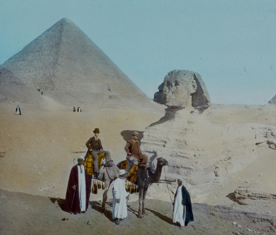 Những người đàn ông cưỡi lạc đà bên cạnh Kim tự tháp và tượng Nhân sư Giza ở Ai Cập. Ảnh chụp năm 1895.