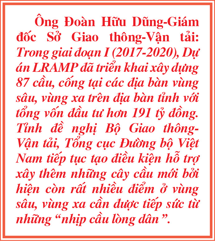 Sau 4 năm triển khai (2018-2021), 87 cây cầu dân sinh bằng bê tông thuộc dự án LRAMP do Tổng cục Đường bộ Việt Nam làm chủ đầu tư đã hoàn thành giúp người dân các xã vùng khó khăn trên địa bàn tỉnh đi lại an toàn, tạo thuận lợi cho phát triển kinh tế-xã hội của địa phương.