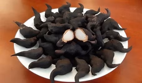 Tôi tò mò ngó đám gia nhân lấy búa khẽ đập cho bong vỏ. Lộ lần thịt trắng nuột. Rồi lại đem cái nhân ấy phơi. Xong đâu đấy họ đem sấy khô và dùng cái thuyền tán (cái nghề đông y luôn sẵn dao cầu, thuyền tán) nghiền thành bột.