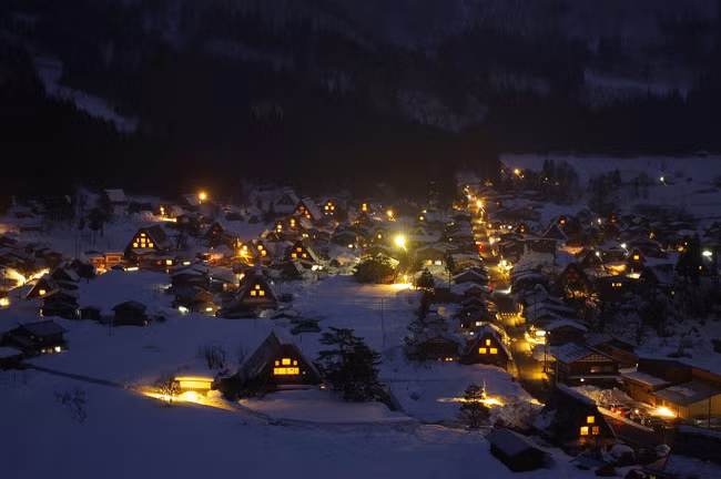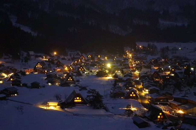 Shirakawa-go là một ngôi làng nhỏ, truyền thống ở Takayama, tỉnh Gifu với những ngôi nhà có mái cao, nhọn theo phong cách Gassho-zukuri. Vào mùa đông, ngôi làng được thắp sáng đẹp lung linh như phong cảnh bạn vẫn thường thấy trên thiệp Giáng sinh và điểm chiêm ngưỡng ngôi làng tốt nhất là nhìn từ phía trên xuống. Cùng với Gokayama, Shirakawa-go đã được UNESCO công nhận là Di sản Thế giới.