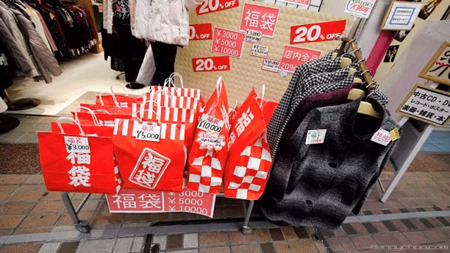 Fukubukuro được gọi là túi may mắn hoặc túi hạnh phúc ở Nhật. Chiếc túi này thường được bán vào ngày 2/1 hằng năm và người mua phải xếp hàng dài hàng giờ để có cơ hội mua được Fukubukuro. Điều hấp dẫn là bạn không thể biết được bên trong có những món đồ nào và số tiền bạn phải bỏ ra mua thường thấp hơn so với giá trị túi hàng.