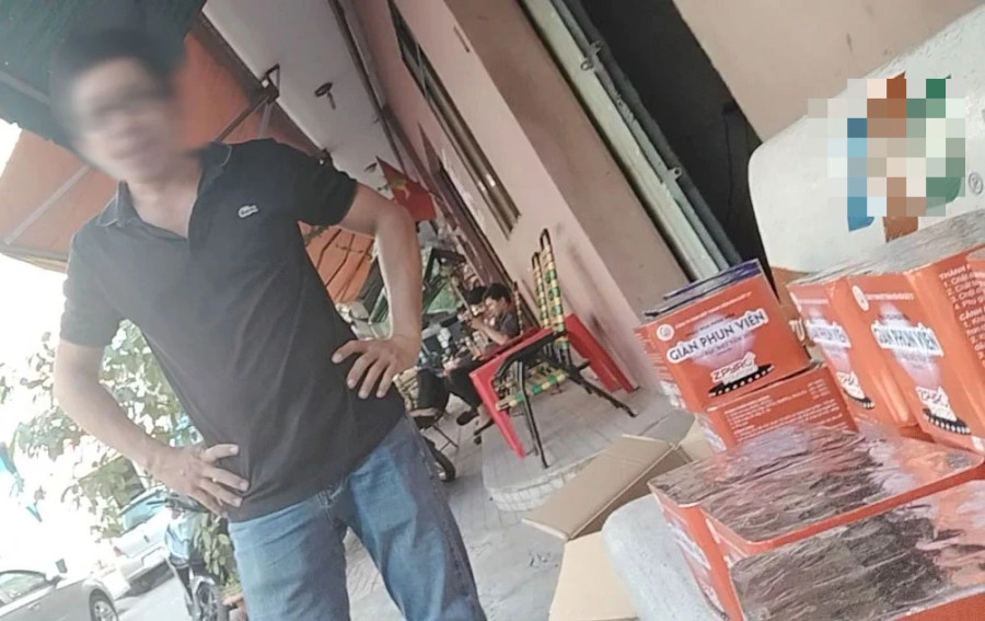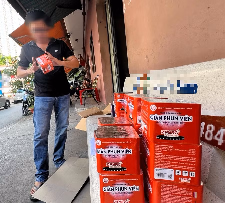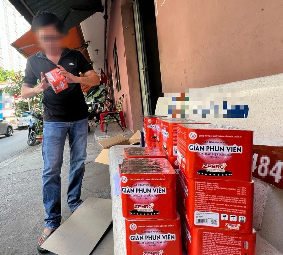 Sau nhiều ngày đeo bám, một ngày cuối tháng 12.2023, chúng tôi phát hiện Tuấn Anh mang một thùng giấy, bên trong chứa 36 hộp pháo hoa, bày trước cửa ra vào chung cư (đoạn cách khu vực để xe khoảng 5 m) cho một người khách kiểm tra chất lượng hàng. Bao bì 36 hộp pháo ghi "Pháo hoa giàn phun hoa, giàn phun viên, loại đặc biệt 2023", Tuấn Anh rao giá 400.000 đồng/hộp và cam kết hàng mới, chất lượng do đơn vị có thẩm quyền sản xuất.