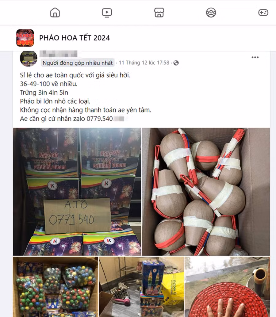 Tài khoản T.T.T thì đăng: "Lưu ý giàn 49 và pháo banh đã có cho anh em mình chơi tết. Khu vực TP.HCM không cọc trước, kiểm tra hàng trước khi thanh toán", kèm số điện thoại liên hệ 0902.709.xxx. Bên dưới mỗi bài viết nói trên là hàng chục lượt bình luận hỏi giá cả và cách giao dịch.
