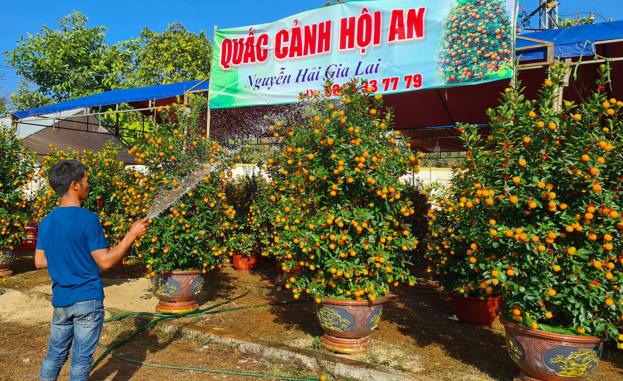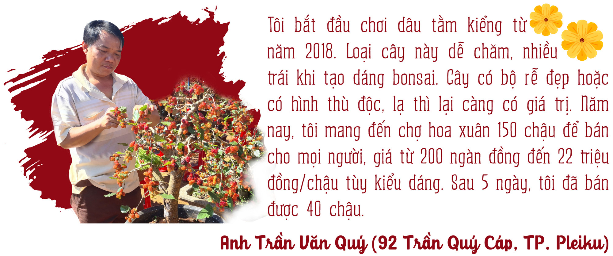 Vừa bán xong một chậu hoa giấy tạo dáng bonsai với giá 1,2 triệu đồng, ông Nguyễn Văn Tân (tỉnh Phú Yên) cho biết: “Tôi mang cây cảnh lên bán ở Gia Lai 6 năm nay rồi. Năm nay, tôi thuê 2 lô để bày bán 200 chậu cảnh các loại, đến thời điểm này đã bán được 20 chậu. Giá bán từ 300 ngàn đồng đến 1,5 triệu đồng/chậu. Mong là những ngày tới sẽ có đông khách mua”.