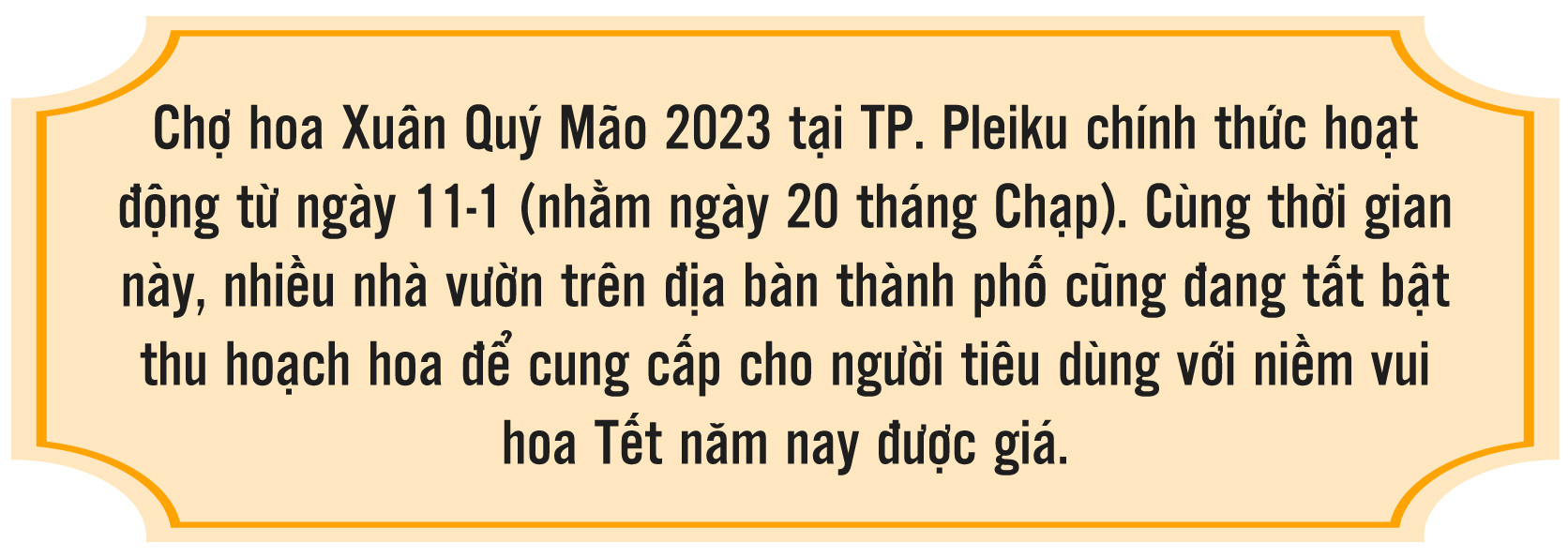 Ông Phạm Thế Tâm-Trưởng phòng Quản lý đô thị TP. Pleiku-cho biết: Chợ hoa Xuân Quý Mão 2023 tại TP. Pleiku diễn ra tại 3 địa điểm: Khu Hội chợ triển lãm tỉnh tại đường Hoàng Đạo Thúy với 296 lô; đường quy hoạch Đ2 thuộc khu quy hoạch suối Hội Phú (đoạn Nguyễn Lương Bằng) với 60 lô và tại số 27 đường Nguyễn Văn Cừ với 154 lô. Theo kế hoạch, chợ hoa xuân bắt đầu hoạt động từ ngày 11 và kéo dài đến hết ngày 21-1 (tức từ ngày 20 đến 30 tháng Chạp).