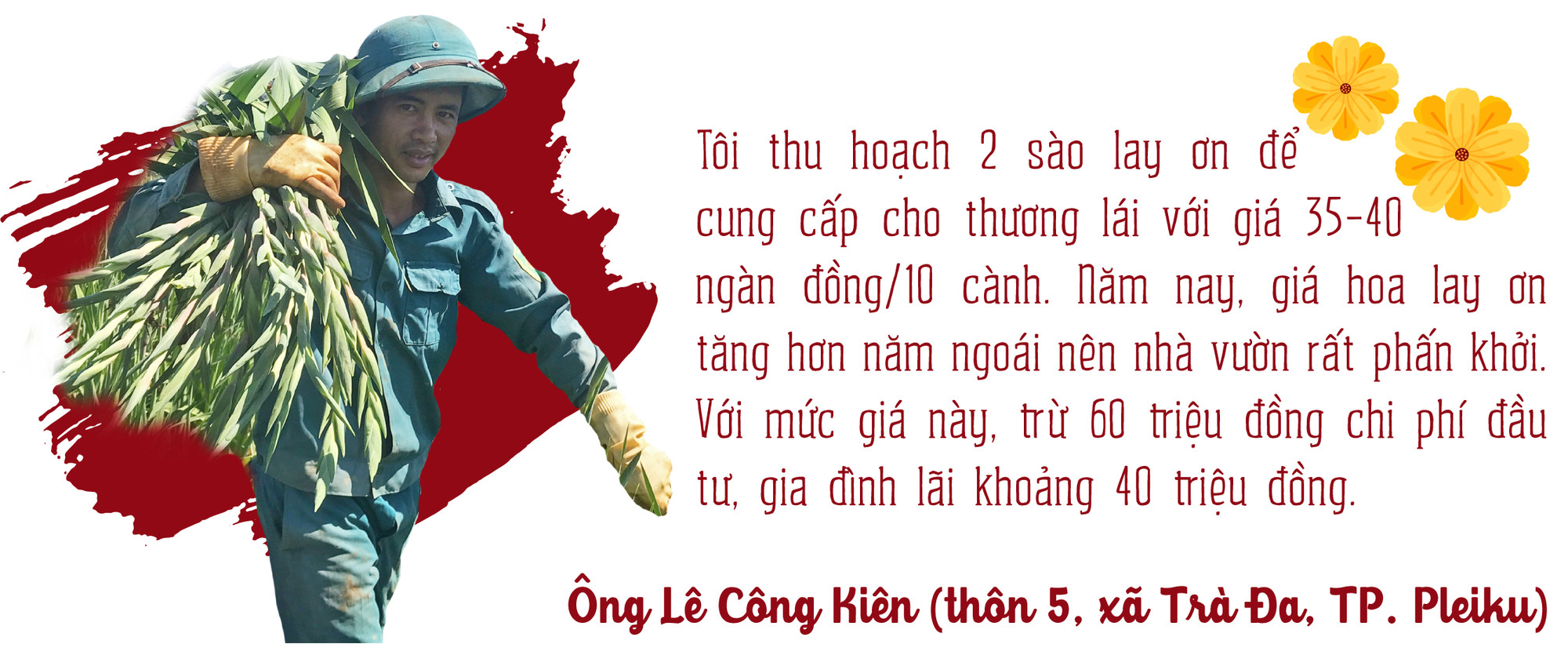 Còn ông Lê Thành Trung (thôn 2, xã An Phú) thì cho hay: “Tôi trồng 3 sào hoa lay ơn giống đỏ mật và đỏ nhập từ Đà Lạt. Do thời tiết không thuận lợi nên sản lượng dự kiến thu được hơn 40 ngàn cành, giảm hơn năm ngoái. Mấy ngày nay, gia đình thuê người nhổ được khoảng 15 ngàn cành bán cho thương lái vận chuyển cung cấp cho thị trường các tỉnh phía Bắc. Cũng may nhờ giá tăng hơn năm ngoái nên dự kiến gia đình lãi khoảng 60-80 triệu đồng”.