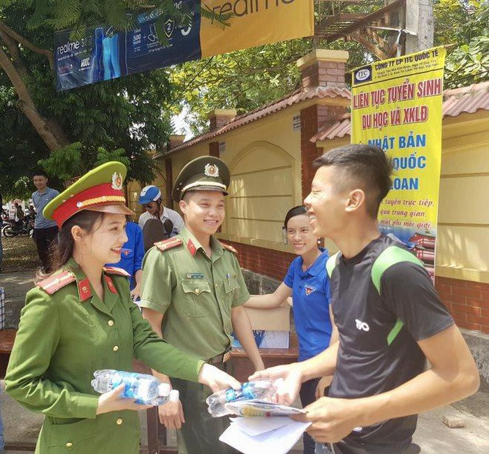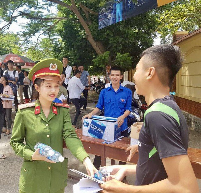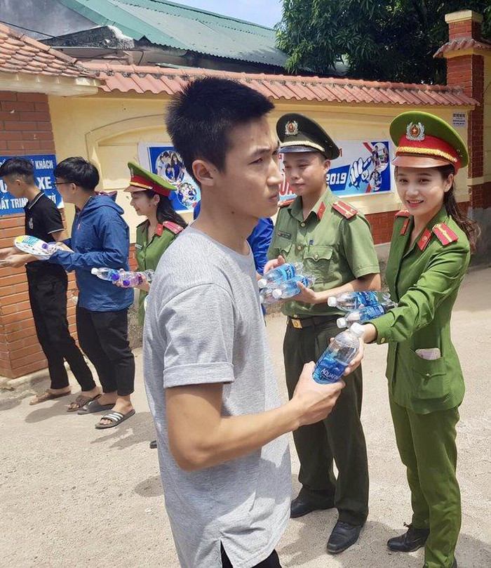 Loạt ảnh được chụp một cách tự nhiên ngay trong khi thiếu úy này đang tham gia công tác tình nguyện: Phát nước, báo, khăn lạnh cho các em thí sinh và người nhà trước cổng trường THPT Đô Lương 1 (xã Đà Sơn, huyện Đô Lương, tỉnh Nghệ An).