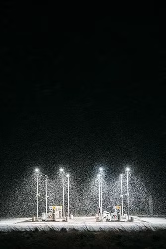 Trạm xăng đêm mưa tuyết.