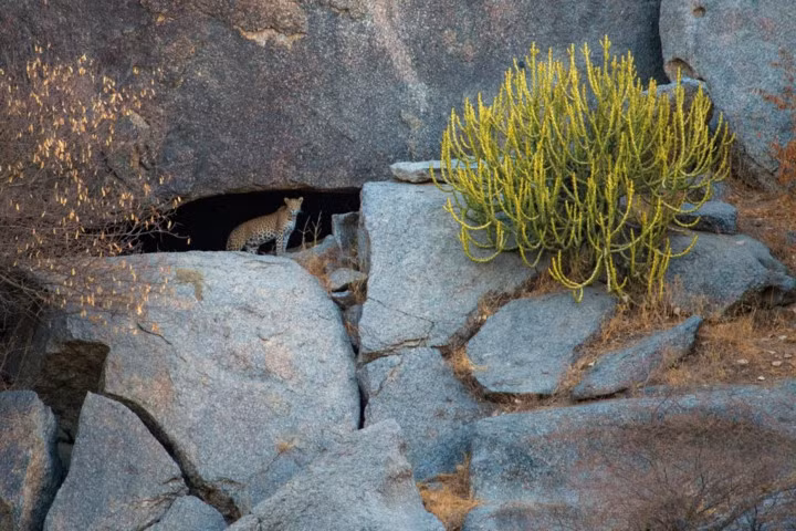 Một con báo cái quan sát xung quanh khu vực hang động nơi các con của nó đang trú ngụ.