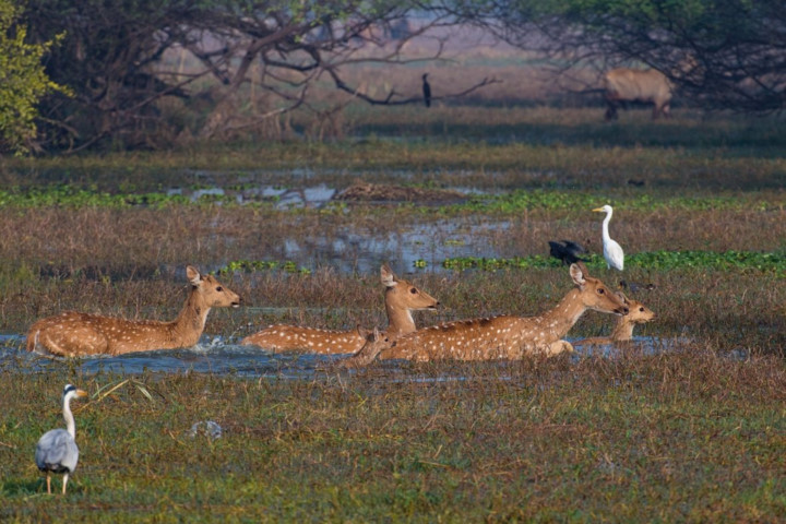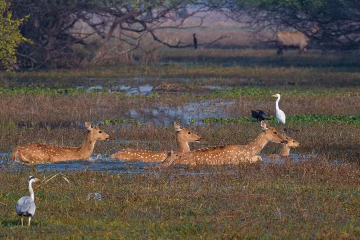 Đàn hươu sao băng qua đầm lầy tại Vườn Quốc gia Keoladeo ở phía đông Rajasthan, Ấn Độ.