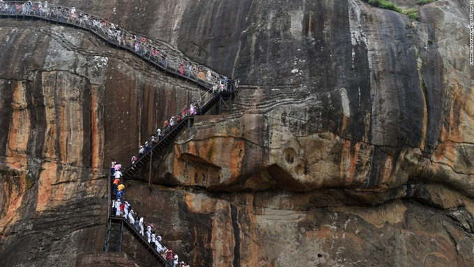 Cách thủ đô Colombo, Sri Lanka, 160 km về phá bắc, pháo đài đá cổ đại của người Sigiriya được xây từ thế kỷ thứ 5, thời vua Kassapa I. Đây là cảnh du khách leo thang bộ tới điểm tham quan.