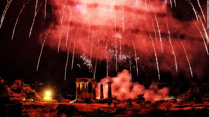 Pháo hoa nổ trên bầu trời Corinth, Hy Lạp để mừng lễ Phục sinh theo lịch cổ của nước này tại đền Appolo.