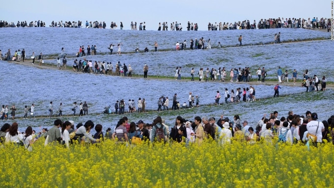 Khung cảnh du khách khắp nơi kéo về tham quan công viên hoa Hitachi Seaside tại Ibaraki, Nhật Bản. Ước tính 4,5 triệu bông hoa bừng nở dịp tháng 4 - 5.