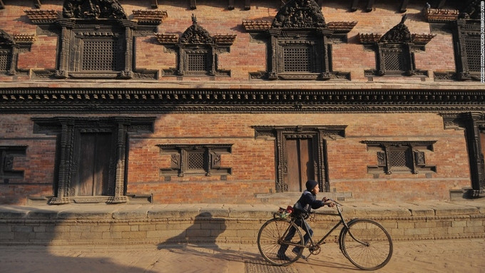 Một chú bé đạp xe qua quảng trường Bhaktapur Durbar, một di sản thế giới được UNESCO công nhận, thuộc thành phố Kathmandu, Nepal. Đây là nơi có rất nhiều ngôi đền cổ, tượng và các cảnh quan lịch sử khác.