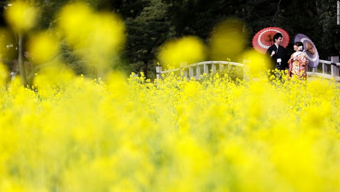Cặp vợ chồng Nhật chụp ảnh lưu niệm trong trang phục truyền thống bên cánh đồng hoa cải vàng ở vườn Hamarikyu, Tokyo, hồi tháng 2. Mùa hoa cải ở đây thường nở vào đầu năm mới, kéo dài từ tháng 2 tới cuối tháng 3.