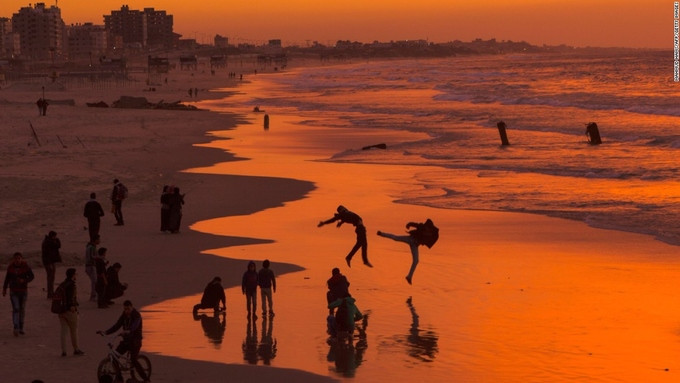 Người Palestines vui chơi dưới ánh hoàng hôn ở một trong những bãi biển của thành phố Gaza, hiện là nơi sinh sống của nửa triệu dân.