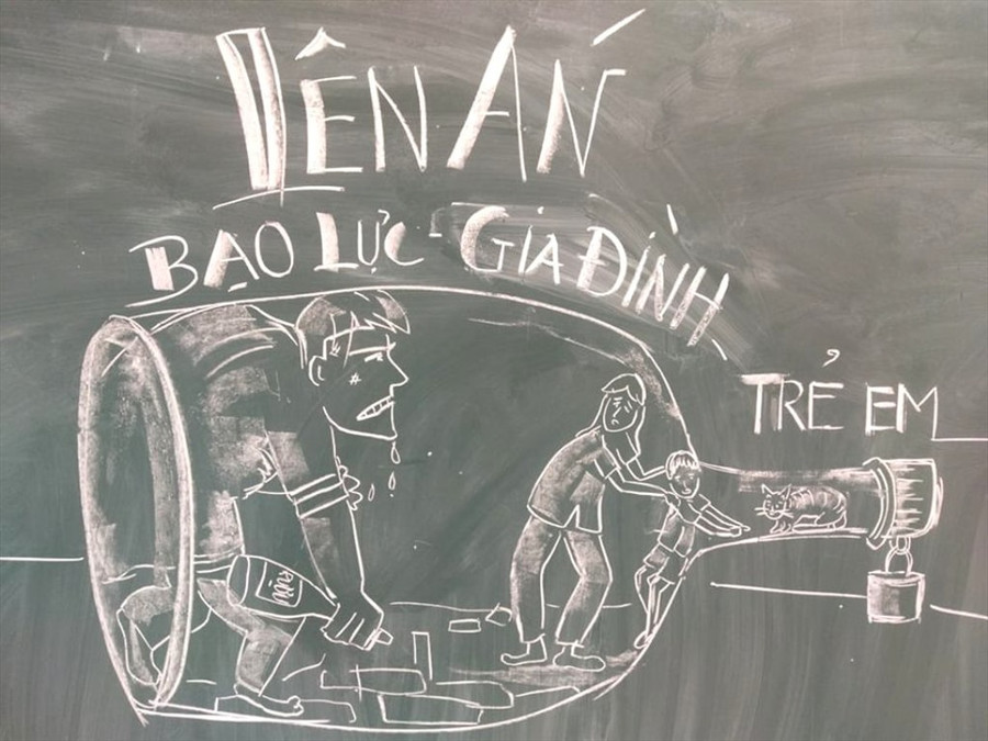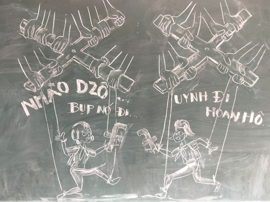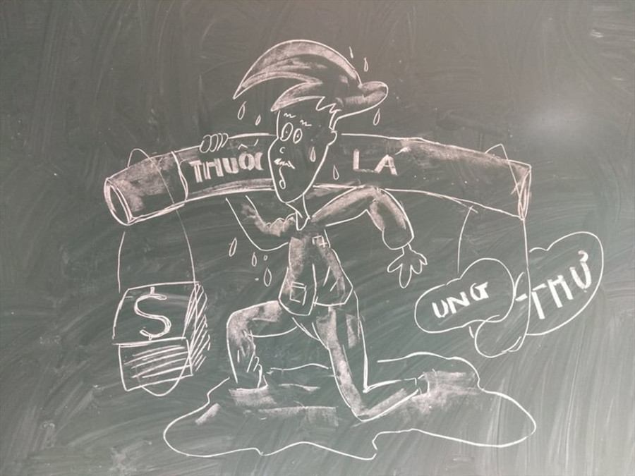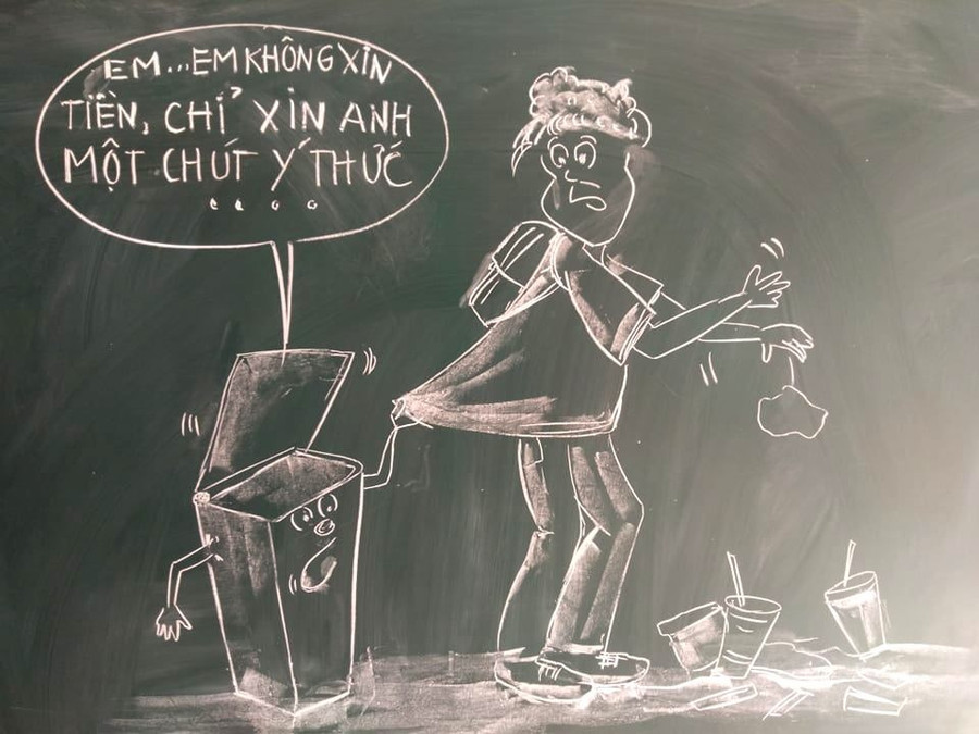 | Các bức tranh biếm họa được thầy Hùng vẽ trên bảng để truyền đi các thông điệp đến học trò. |