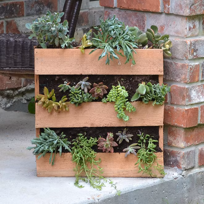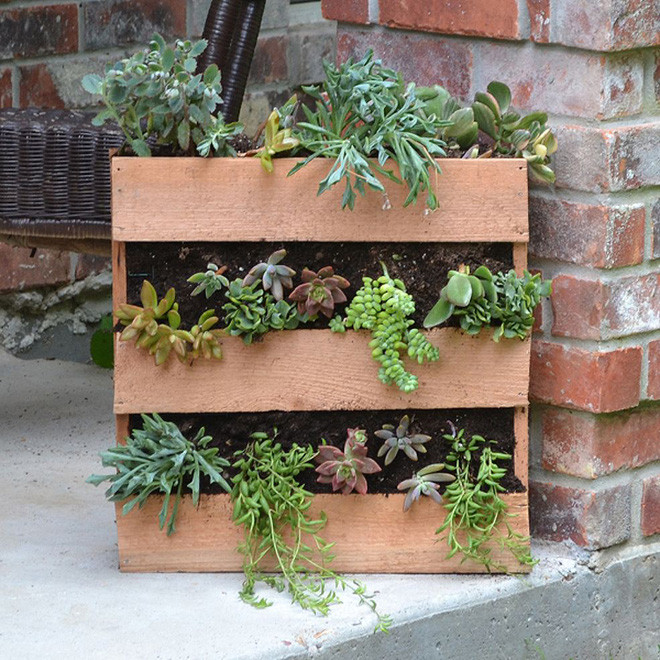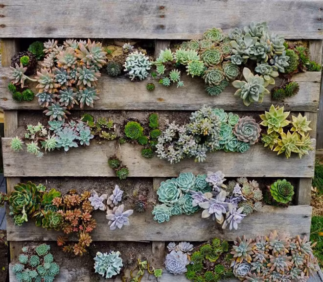 Một tấm gỗ pallet đã cũ theo thời gian sẽ hoàn hảo nếu bạn có thể sử dụng chúng làm chậu cây cho những loại cây mọng nước của mình. Chúng trông hoàn toàn đối lập với những mảnh gỗ bóng bẩy, thay vào đó chúng sẽ trông rất tự nhiên khi được kết hợp với nhau.