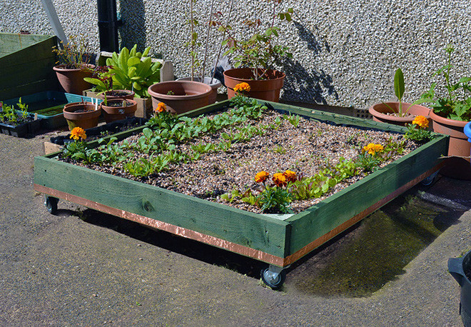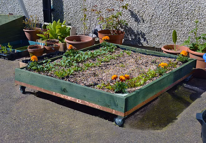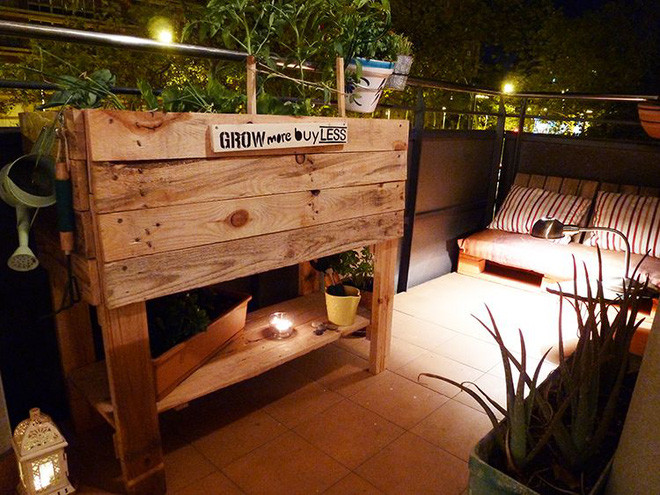 Bạn vẫn có thể có một khu vườn khi bạn bị bao quanh bởi bê tông, cốt thép, chỉ cần bạn sáng tạo. Ví dụ như bạn có thể có một chậu cây di dộng. Nó có thể là một chiếc hộp trong bóng râm với bánh xe bên dưới để tiện di chuyển tới bất cứ đâu mà bạn muốn. Hãy sử dụng những tấm bảng gỗ từ một thanh gỗ pallet để làm chiếc khung và sau đó bỏ đầy đất vào. Đừng quên là bạn sẽ cần vải hoặc bạt bên dưới trước khi bỏ đất vào trồng cây nhé.