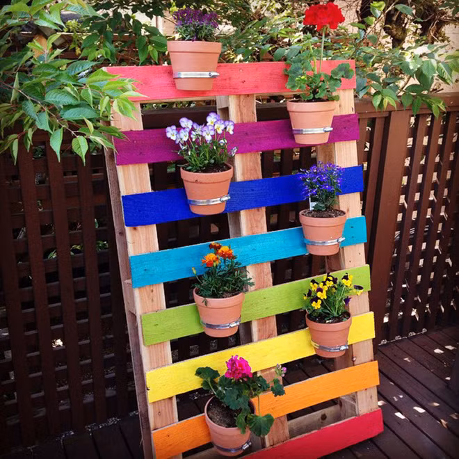 Hiển nhiên việc lựa chọn sơn thêm màu là ý tưởng hoàn toàn tuyệt vời cho khu vườn theo chiều dọc của bạn. Nếu bạn có kế hoạch sử dụng gỗ pallet cho dự án này, bạn có thể sơn chúng theo màu sắc khác nhau, mỗi màu cho một tấm gỗ để trông chúng thật sặc sỡ và nổi bật. Sau khi sơn màu xong, thì có thể đóng thêm thanh kim loại mỏng đễ giữ chậu, giai đoạn này bạn sẽ cần đến kẹp, bu-lông và khoan.